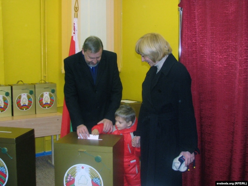Андрэй Саньнікаў прыйшоў галасаваць першым з кандыдатам. А 9-й раніцы ён прыехаў на выбарчы ўчастак у будынак гімназіі нумар 18 на вуліцы Калініна ў Менску разам з жонкай Ірынай Халіп і сынам Данікам.