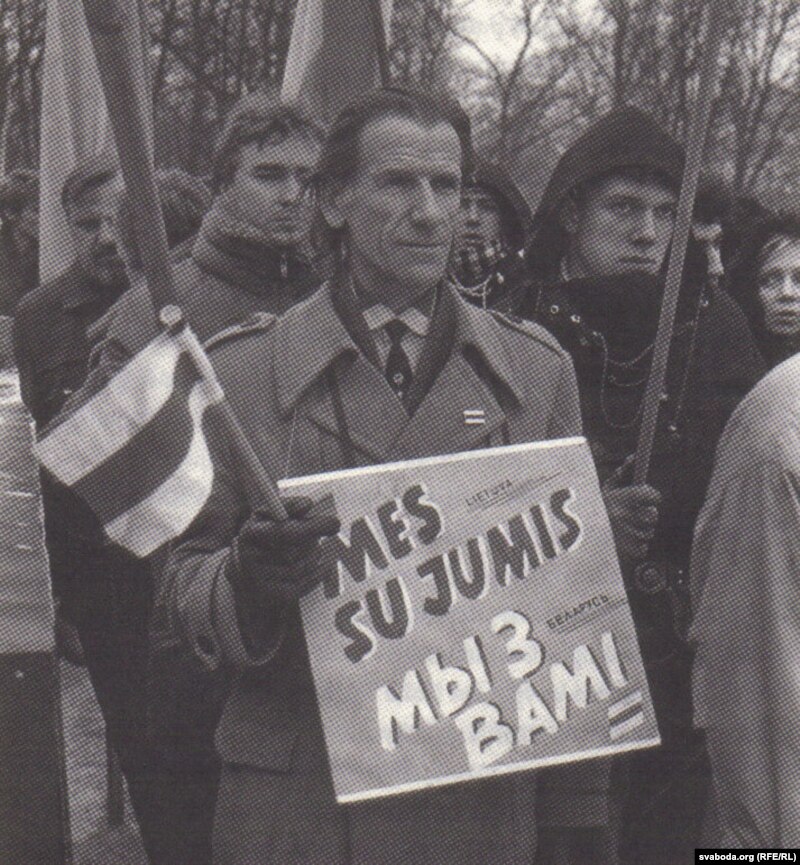 Вакол будынку літоўскага парлямэнту – дзесяткі, а мо і сотні тысяч людзей, яны выйшлі падтрымаць Вярхоўны Савет. Бэтонныя блёкі, барыкады з арматуры, паляцца вогнішчы, людзі трымаюцца за рукі і сьпяваюць песьні. Сярод жоўта-зялёна-чырвоных літоўскіх і нашыя, бел-чырвона-белыя сьцягі. Сярод абаронцаў літоўскай свабоды і беларусы – і тыя, што стала жылі ў Літве, і актывісты Народнага Фронту з Менску. Уладзімер Кармілкін гэтым разам не з фотапаратам, а з плякатам.