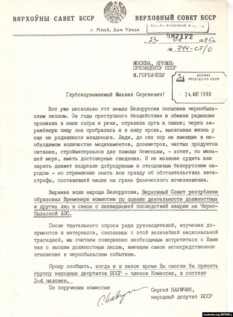 Думаю, Гарбачоў прачытаў толькі тое, што падкрэсьліў у лісьце невядомы мне ягоны рэфэрэнт: “Вярхоўны Савет рэспублікі ўтварыў Часовую камісію па ацэнцы дзейнасьці службовых і іншых асобаў у сувязі зь ліквідацыяй наступстваў аварыі на Чарнобыльскай АЭС… калі і ў які час Вы маглі б прыняць групу народных дэпутатаў БССР – членаў Камісіі, у складзе 3-4 чалавек?”