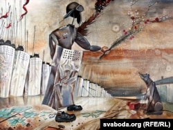 Скобла: “Давайце пагаворым пра ваш твор “Здані, або Пераможцы”, які таксама не атрымаў пропуск у Палац мастацтва. Я разумею, што гэта вельмі няўдзячная справа – тлумачыць сваю карціну. Але давайце пойдзем на такі вынятак для Радыё Свабода. Такім чынам, што мы бачым на палатне?”