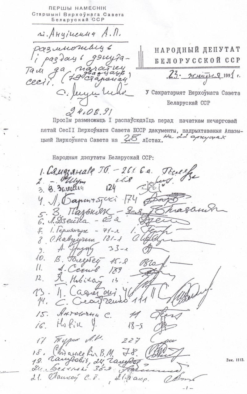 Заяўка дэпутатаў Апазыцыі БНФ на раздрукоўку пакету дакумэнтаў аб абвяшчэньні Незалежнасьці Беларусі, 23 жніўня 1991 г.