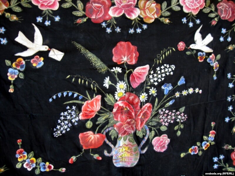 — Дык у вайну ж нідзе нічога ня можна было купіць. А даўней жа ткалі сваё палатно зь лёну. У кожнага гэты матэрыял быў. Скажа пафарбаваць чорным. На чорным ён маляваў. Дык езьдзяць, шукаюць фарбы адзін у аднаго. У Глыбокае лятуць, знойдуць. А людзі якія былі дружныя! Адзін аднаму дапамагалі. Адзін скажа, дзе браў — едзь і ты там вазьмі. Трыццаць хат малявалі ў вёсцы. Нават па два было. Дзе дзьве дзеўкі ў хаце, то і па два дываны малявалі.