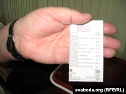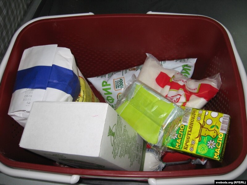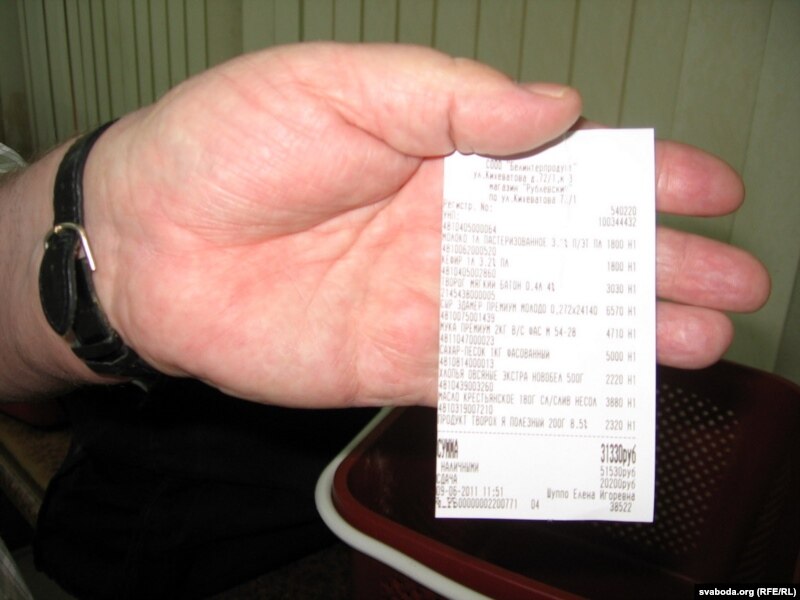 Антанюк: «Зараз паглядзім. Самае неабходнае — будзем перакладаць і лічыць: мука, шматкі, тварог, цукар, сыр, кефір і малако. Хлеба, бульбы, гародніны — гэтага нічога я ня браў. І зараз паглядзім, колькі я заплаціў — 31 тысяча 330 рублёў».