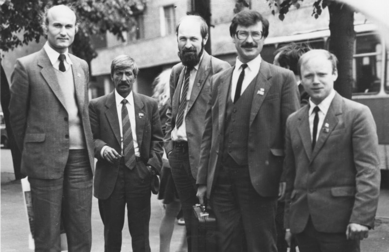 Парлямэнцкая апазыцыя БНФ. Паездка ў Магілёў. 1990. Зьлева направа — Зянон Пазьняк, Барыс Гюнтэр, Алег Трусаў, Валянцін Голубеў, Юры Беленькі