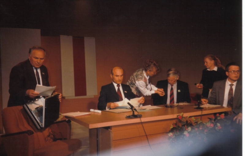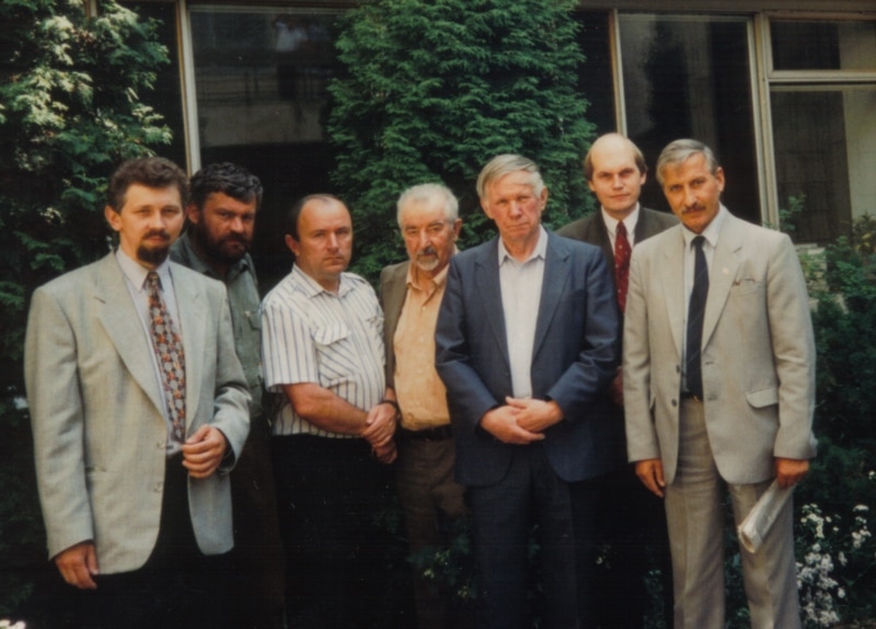 Сяргей Навумчык, Уладзімер Арлоў, Лявон Дзейка, Рыгор Барадулін, Васіль Быкаў, Лявон Баршчэўскі, Мікола Крыжаноўскі. Зьезд Партыі БНФ, лета 1995.