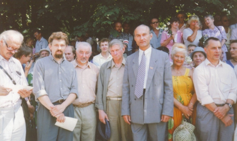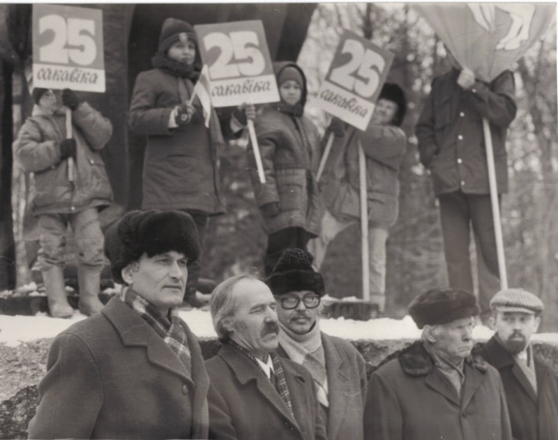Мікола Купава, Сяргей Навумчык, Лявон Баршчэўскі, Рыгор Барадулін, Аляксандар Старыкевіч, Васіль Быкаў, Зянон Пазьняк, Сяргей Папкоў на мітынгу БНФ. Парк Янкі Купалы, 1995 год