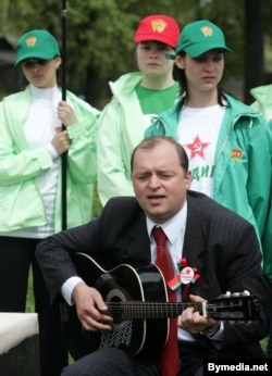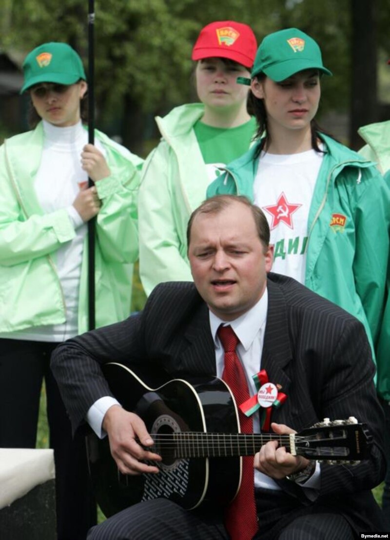 Леанід Кавалёў у час, калі быў першым сакратаром БРСМ, сьпявае ваенна-патрыятычную песьню на сустрэчы з вэтэранамі.