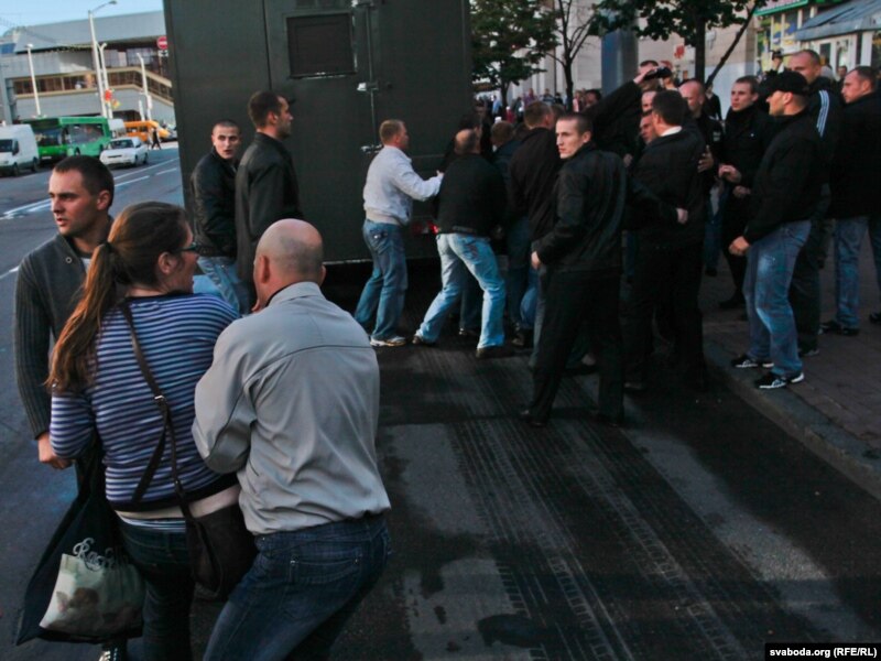 19:50 Людзі ў цывільным ня менш за 50 чалавек выскачылі з чырвонага аўтобусу. Пачалі адцясьняць людзей, якія знаходзяцца каля пачатку вуліцы Кірава. Міліцыянты сталі ланцугом, і выцясьняюць людзей з плошчы. Траіх схапілі і цягнуць за рукі і ногі ў аўтобусы.