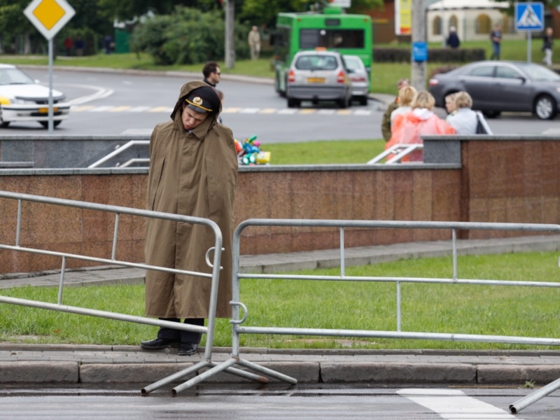 10:55 Узмоцненыя захады бясьпекі на падыходах да месца правядзеньня вайсковага параду. Яшчэ да скрыжаваньня Пераможцаў і Машэрава неабходна прайсьці тры міліцэйскія кардоны, людзей прапускаюць толькі праз турнікеты. Міліцыянты праз гукаўзмацняльнікі папярэджваюць, каб грамадзяне не зьбіраліся ў адным месцы, а праходзілі на глядацкія пляцоўкі і займалі месцы ў адпаведнасьці з запрашэньнямі. Людзей без запрашэньняў накіроўваюць у глядацкі сэктар каля гатэлю «Плянэта».