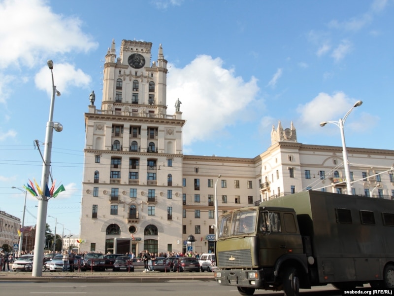 Здымаюць на відэакамэру, правяраюць пашпарты ў моладзі, кажуць, што тут будзе спэцмерапрыемства. За высотным будынкам гатэлю стаіць аўтазак і некалькі міліцэйскіх аўтобусаў.
