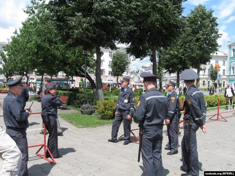 Міліцыянты й людзі ў цывільным — а іх было некалькі дзясяткаў — і блізка не падпускалі людзей да пляцоўкі Дома культуры «Віпра», дзе меліся сабрацца мінакі на нефармальны мітынг.