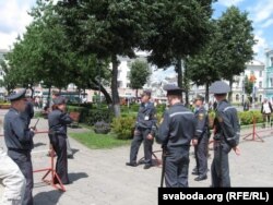 Супрацоўнікі міліцыі сур’ёзна рыхтаваліся да таго, што народу зьбярэцца нашмат больш: яшчэ ў 18:30 плошчу Перамогі абгарадзілі па пэрымэтры жалезнымі загарадкамі, а з чатырох бакоў усталявалі турнікеты з мэталашукальнікамі.