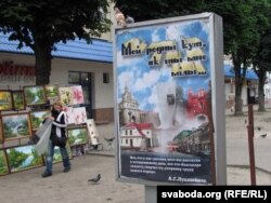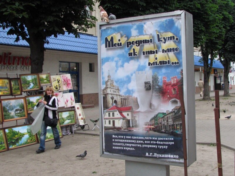 Рынкі — найбольш людныя месцы і найбольш выгадныя для рэклямы. Сацыяльна-палітычная рэкляма з цытатай Лукашэнкі ля цэнтральнага рынку Берасьця.