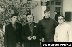Выпускнікі МРТІ падчас працы на касмадроме Байканур. Зьлева направа: Вячаслаў Фрэнкель, Лявон Дзейка, Пятро Кавалёў, Леў Марголін. Восень 1973 г.