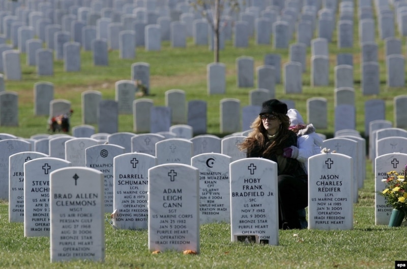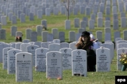 Жанчына на сэкцыі 60 Арлінгтонскіх могілак, на месцы, дзе хаваюць амэрыканскіх вайскоўцаў, загінулых у Іраку