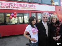 Прафэсар Рычард Доўкінс (у цэнтры) фатаграфуецца на фоне плякату ў цэнтры Лёндану з напдісам: "Верагодна, Бога няма. Так што спыняйце хвалявацца і радуйцеся жыцьцю"