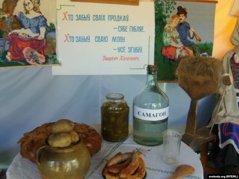 Сьвяда духу ператварылася ў сьвята жывата. Рэстаранная разьвясёлая атмасфэра лунала над бясконцымі прылаўкамі, якія ламаліся ад розных прысмакаў. Сям-там, праўда, трапляліся і кнігі. З пап’е-машэ, бутафорскія. Бутафорскімі аказаліся і ёмістыя бутлі з надпісам “Самагон”, якія стаялі на бутафорскіх сталах, вакол якіх сядзелі бутафорскія беларусы ў вышываных строях.