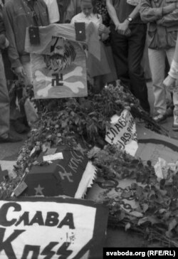 Тая труна была прынесеная да будынку ЦК з плошчы Леніна, ад Дому ўраду, і пранесеная праз увесь Ленінскі праспэкт – натуральна, без усялякай санкцыі ўладаў. Мы зь Зянонам Пазьняком, Сяргеем Антончыкам ды Лявонам Баршчэўскім прыехалі да ЦК, калі там ужо ішоў мітынг.