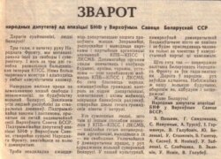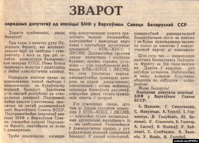 Што гэта так – пацьвярджае палітыка Беларускага Народнага Фронту за ўсе гады змаганьня. Дарога ў народны рух заўсёды адчыненая. Набліжайма ж нашу вольную будучыню, абаронім яе, адбудуем і засьцеражом. Жыве Беларусь! Народныя дэпутаты апазыцыі БНФ у Вярхоўным Савеце БССР: З. Пазьняк, Г. Сямдзянава, С. Навумчык, А. Трусаў, І. Гермянчук, В. Галубовіч, Ю. Беленькі, У. Станкевіч, Б. Гюнтэр, А. Сасноў, Я. Новікаў, У. Заблоцкі, С. Слабчанка, В. Зяленін, У. Новік, В. Голубеў” – надрукавана на першай паласе “Народнай газэты” 31 жніўня 1991 г.