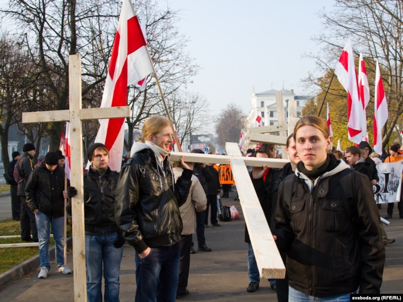 11:15 Актывісты «Маладой Беларусі» трымаюць партрэты палітвязьняў, скандуюць «Жыве Беларусь!», «Незалежнасьць», імёны палітвязьняў. Нясуць расьцяжку «Моладзь ідзе — Беларусь жыве». «Ціхары» ідуць і лузгаюць семкі.