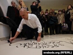 Мастацтва каліграфіі гэтым разам склалася ў экспазыцыю, якая прадстаўлена тут толькі станковымі творамі. Аўтар кажа, што ён захацеў зрабіць выставу чыстага мастацтва хоць ён вядомы яшчэ як афармляльнік не аднаго дзясятка кніг. Ён афармляў амаль усе кнігі «Бібліятэкі Свабоды». Але кніжная частка яго творчасьці на гэтай выставе не прадстаўленая. Гэта плянуецца ў адмысловай выставе. Але адсылкі да зробленага афармленьня кніг, у тым ліку і Бібліятэкі Свабоды, на гэтай выставе прысутнічаюць. Напрыклад, Альфабэт Свабоды", а таксама адсылкі да кніг Васіля Быкава, Рыгора Барадуліна і іншых.