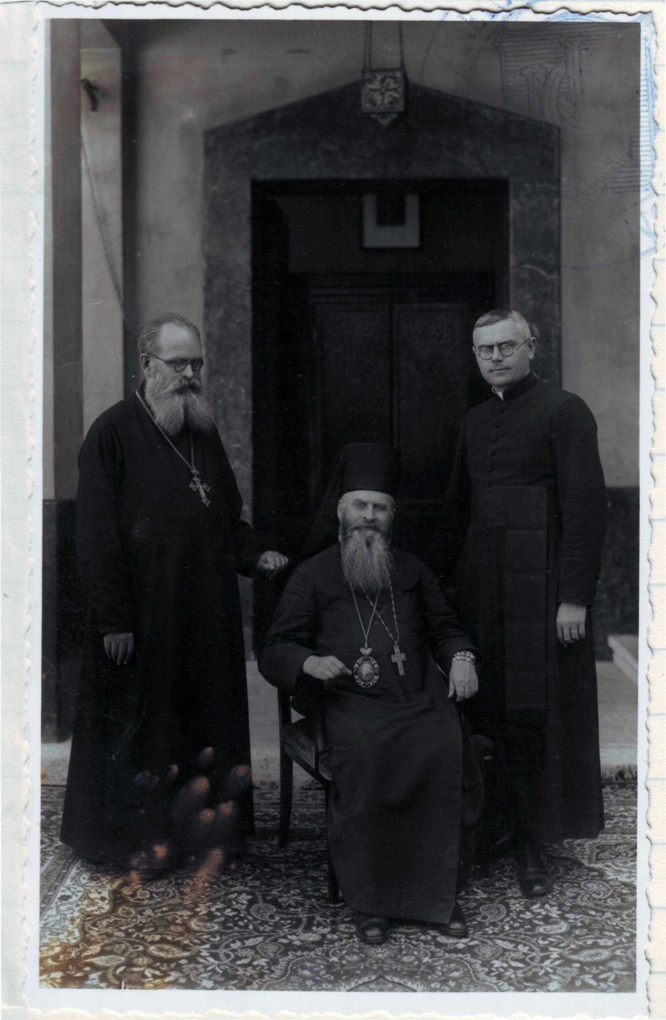 Біскуп Ф. Бучыс з беларускімі сьвятарамі-марыянамі Ф. Абрантовічам і А. Цікотам. Рым, 1920-я гг.