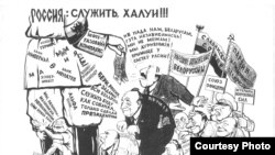 Гэтая карыкатура зьявілася недзе на пачатку 1994 года — калі ўводзілася ў Канстытуцыю прэзыдэнцтва і Кебіч і Лукашэнка пачалі наўздагон агітаваць за ўвядзеньне расейскага рубля ды «самую шчыльную інтэграцыю з Расеяй. Ня памятаю, ці была яна зьмешчаная ў якой-небудзь незалежнай газэце. На жаль, ня ведаю і імя аўтара. Уласна, у той час я ведаў двух майстраў палітычнай карыкатуры. Сяргей Харэўскі зьмяшчаў свае творы ў «Свабодзе» Ігара Гермянчука. Лявонцій Зданевіч (архітэктар, дэпутат Апазыцыі БНФ) свае карыкатуры не друкаваў — але калі ён пускаў іх па сэктарах Авальнай залі, праца парлямэнту была спаралізаваная.