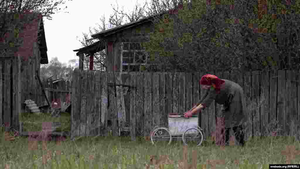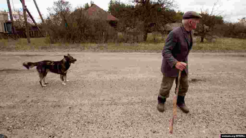 Іван Шамянок на сваім падворку. Самы старэйшы жыхар вёскі, ягоная жонка памерла 10 гадоў таму. Летась дзед Іван пахаваў свайго брата, які таксама тут жыў