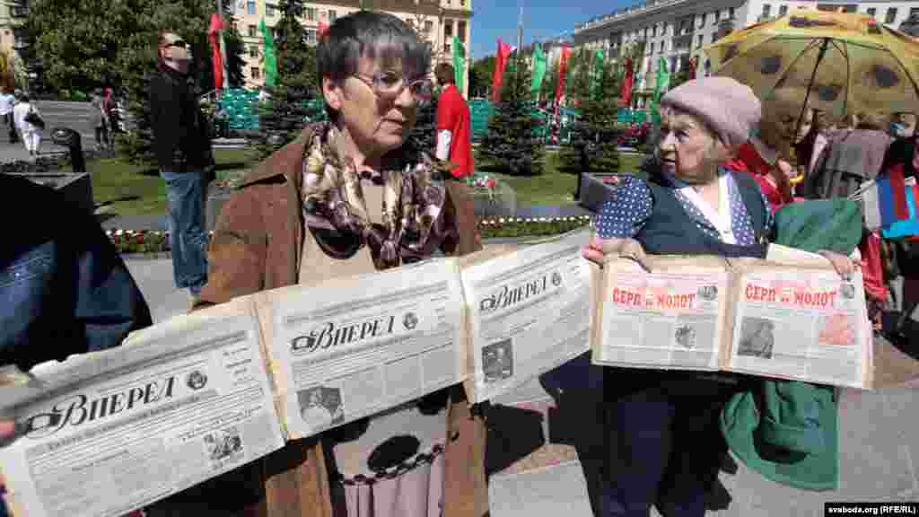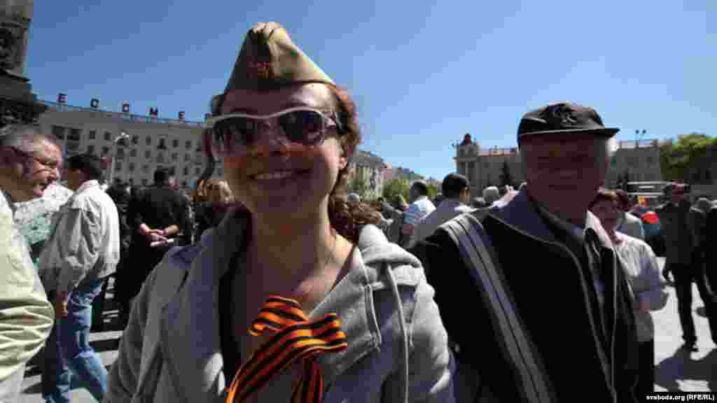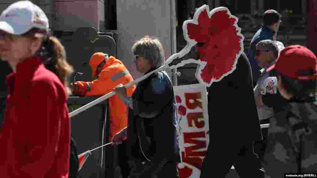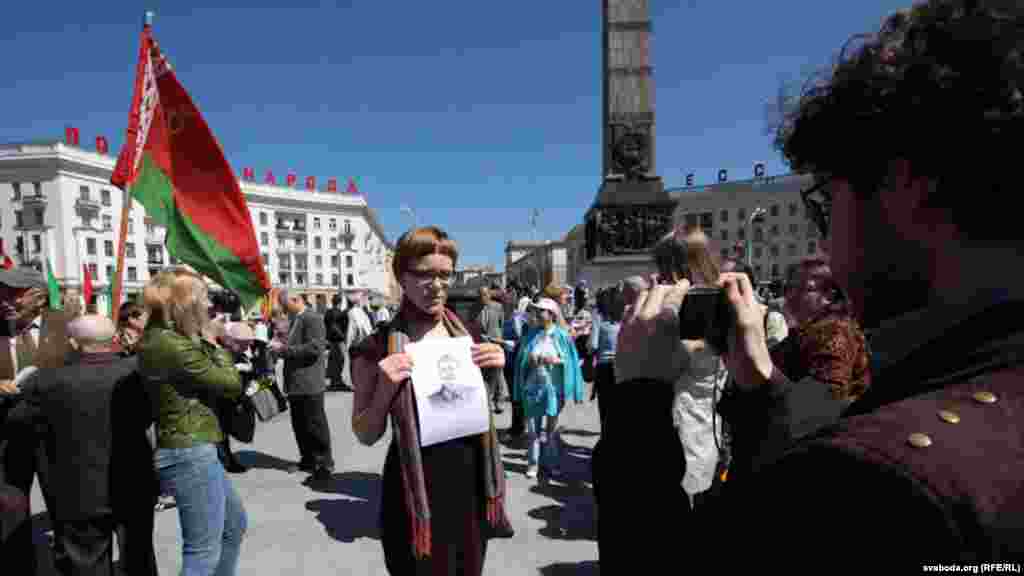 Міліцыя затрымала вядомую "жанчыну ў чырвоным" Людмілу Калантай, якая ішла з чырвоным сьцягам, каб ускласьці кветкі да помніка Перамогі