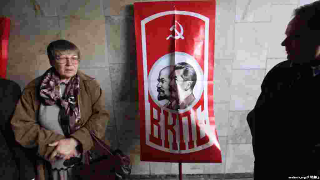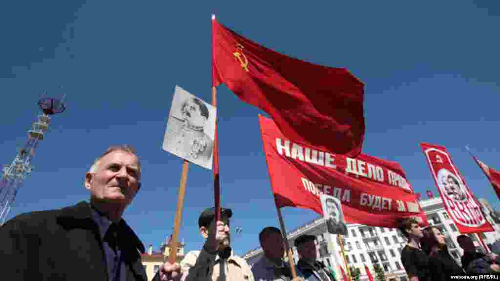 Актывісты былой Усесаюзнай камуністычнай партыі трымалі партрэты Сталіна