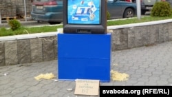 Каля тэлевізара актывісты выставілі таблічку «Ахвяраваньні на БТ» і кідалі грошы як сымбаль таго, што дзяржаўная прапаганда каштуе вельмі танна і раскіданыя актывістамі грашовыя купюры — максымум таго, чаго яна вартая.
