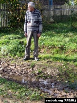 39-гадовы Міхась Кандраценка разам з жанчынамі вядуць мяне на ўскраіну вёскі, дзе дарога ўся ў выбоінах ды калдобінах. Не магу і ўявіць, як тут можна ня тое што праехаць — прайсьці ў асеньнюю слоту ці зімовую завею.