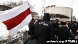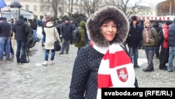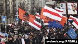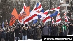 12.45 Дзяўчаты крычаць «Люблю Беларусь!» Ходнікі вельмі вузкія, не ачышчаныя ад сьнегу. Цяпер удзельнікі ідуць уздоўж друкарні — на іншы бок вуліцы калёну не пусьцілі міліцыяты.