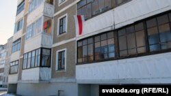 Сьцяг Тамара Шчапёткіна перавесіла ўнутр лоджыі, і з вуліцы яго па-ранейшаму відаць.