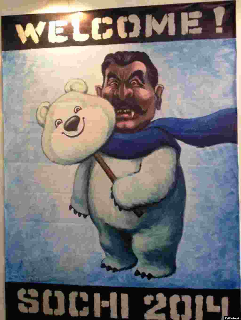 На малюнках у сатырычнай форме маляваліся алімпійскія кольцы ў выглядзе шыбельнай пятлі, мядзьведзік — сымбаль алімпіяды, які топча фігурыстаў, альбо Сталін, які хаваецца пад маскай бяскрыўднага мядзьведзіка.