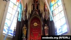 — Цудам захаваліся алтары. Толькі трохі іх адбудоўвалі. Гэта алтары, якія перанесеныя са старога касьцёла. Сярэдзіна 18-га стагодзьдзя. Яны не зусім адпавядаюць стылю. Барочныя, старыя алтары.