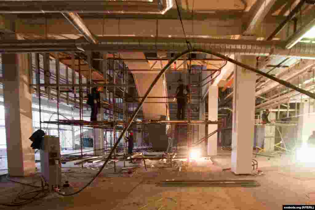 За тры тыдні да заплянаванага адкрыцьця працы тут ідуць у аўральным рэжыме. У прымусовым парадку на стратэгічны аб'ект заганяюць студэнтаў і працаўнікоў дзяржаўных прадпрыемстваў. Аднак фінішу не відаць.