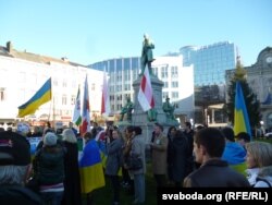 «Мне патэлефанавалі прадстаўнікі ўкраінскай дыяспары Бэльгіі. Сказалі, што будуць ладзіць каля Эўрапарлямэнту акцыю салідарнасьці з суайчыньнікамі, якія патрабуюць збліжэньня з Эўропай. Мы вырашылі падтрымаць украінскіх братоў, прыехалі ў Брусэль, разгарнулі побач з плякатамі і жоўта-блакітнымі сьцягамі нашы бел-чырвона-белыя сьцягі. Разам памаліліся за народ, прадстаўнік партыі «Свабоды» прачытаў зварот да эўрапейскіх палітыкаў – пра тое, каб яны паспрыялі памкненьням украінцаў быць разам з Эўропай, а не з Расеяй».