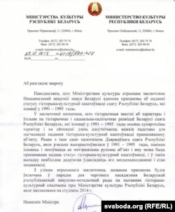 У лісьце, які падпісаў намесьнік міністра культуры Рэспублікі Беларусь Аляксандар Яцко, паведамляецца: