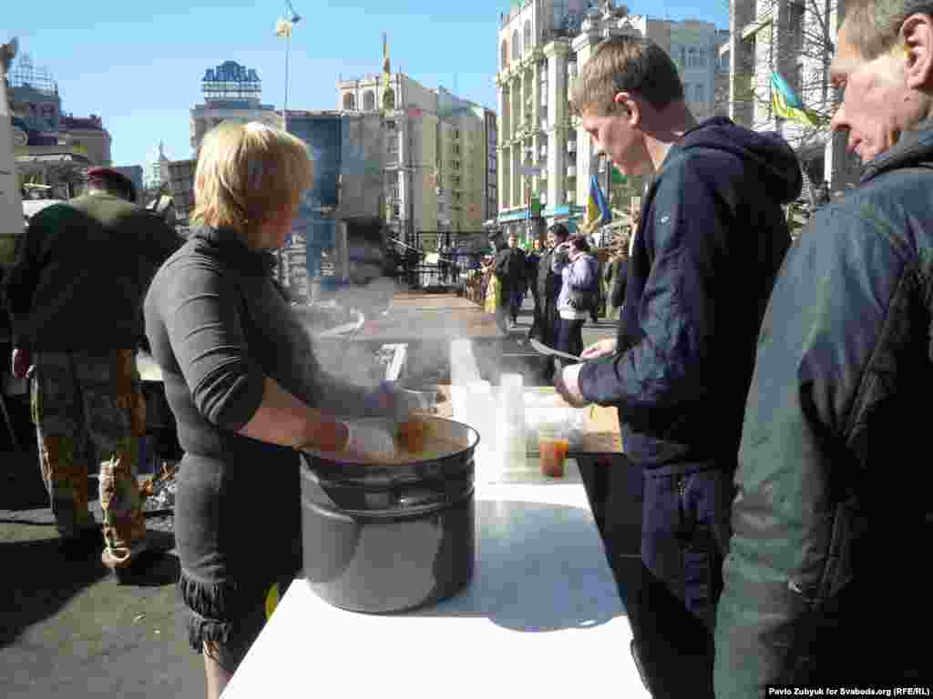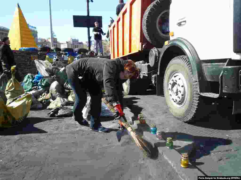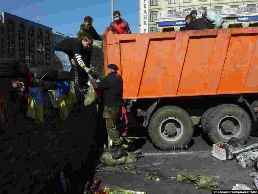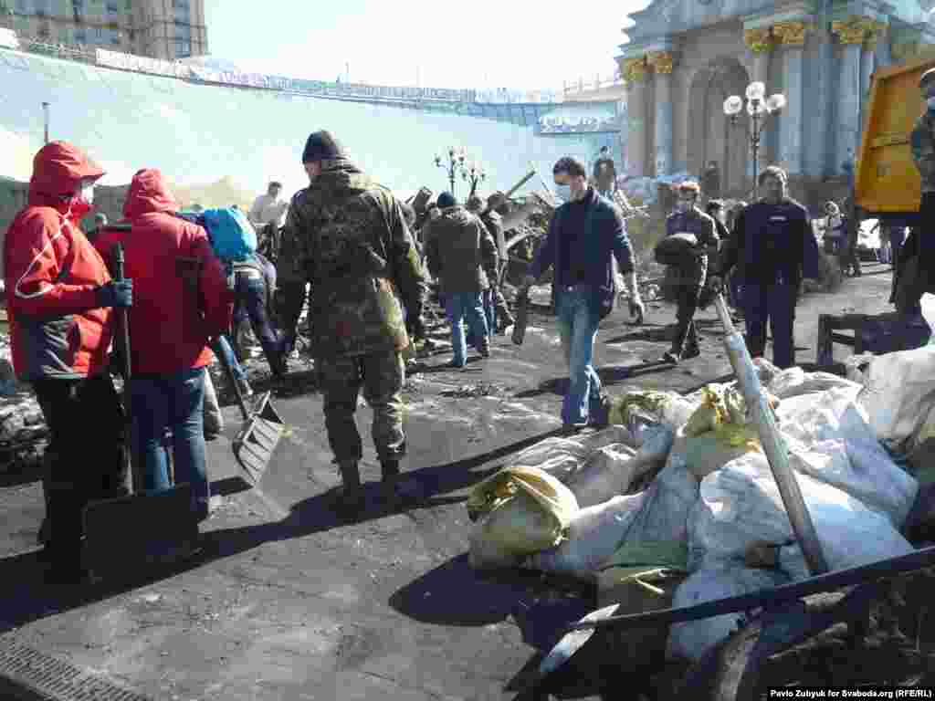Гэтымі выходнымі у Кіеве адбылося прыбіраньне Майдану Незалежнасьці, а таксама дэмантаж часткі барыкадаў. Адчыненая для праезду і вуліца Грушэўскага, на якой засталіся дэкаратыўныя барыкады у гонар загіблых. На адной зь іх усталяваны партрэт Жызнеўскага і бел-чырвона-белы сьцяг. Фотагалерэя: Паўло Зуб'юк