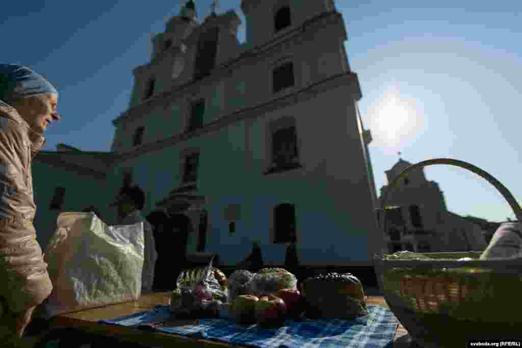 Дзяўчына адна зь першых прыйшла да Катэдральнага сабору Сашэсьця Сьвятога Духу, каб асьвяціць велікодныя стравы