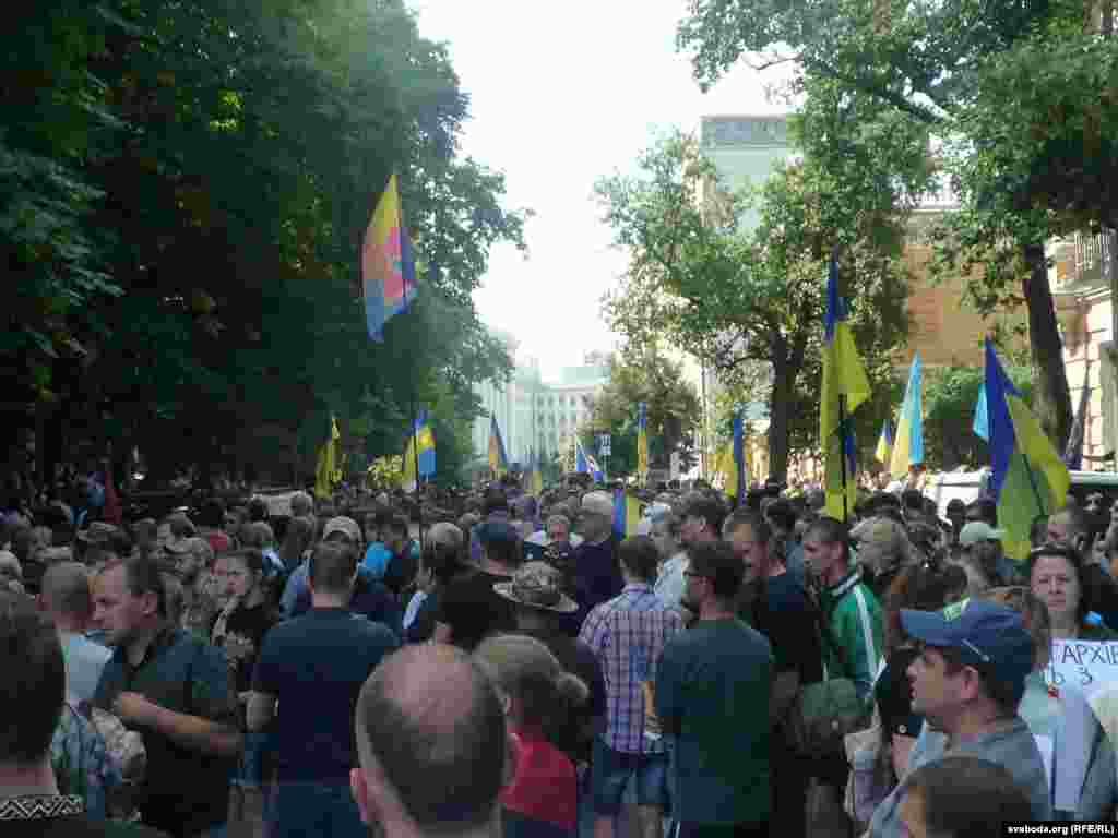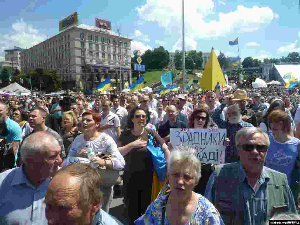Сёньня зраніцы, перад плянаваным народным вечам на Майдане Незалежнасьці, ля сьценаў Адміністрацыі Прэзыдэнта Ўкраіны адбылася акцыя пратэсту супраць нерашучасьці ўлады ў барацьбе супраць тэрарыстаў на ўсходзе краіны. Некалькі тысячаў грамадзянаў, а таксама байцы спецбатальёну «Данбас» сабраліся, каб перадаць прэзыдэнту свае патрабаваньні. Выступы прадстаўніка Міністэрства ўнутраных справаў і прадстаўніка прэзыдэнта былі сустрэтыя агрэсіўна, людзі не давалі чыноўнікам гаварыць, заглушаючы крыкамі «Ганьба» і сьвістам. Пасьля перадачы патрабаваньняў прэзыдэнту, натоўп вырушыў на Майдан Незалежнасьці, дзе адбылося ўсенароднае веча. Патрабаваньні веча — тыя ж самыя: спыніць «перамір’е», якое — на думку ўдзельнікаў — не прыносіць ніякае карысьці, правесьці рашучыя ваенныя дзеяньні супраць баевікоў «тэрарыстычных» арганізацыяў. Акрамя таго, людзі не задаволеныя тым, што ў перамовах удзельнічае «шэры кардынал» часоў Кучмы і Януковіча, кум Пуціна — Віктар Медвядчук.