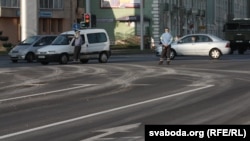 «Вось гэта змываюць і зьмятаюць, бо пойдзе пыл. Калі адкрыць рух па гэтым участку, то пойдзе пыл. А ў горадзе падняць пыл, потым мы тыдзень яго будзем прыбіраць. Дык мы яго адразу прыбіраем, каб яго не было. Інакш ён на дамах, на шкле асядзе, ён некуды ж дзенецца. А так мы яго змываем, зьмятаем у кучы і стараемся адразу сабраць, бо так зручней — адразу сабраць. Трэба ўсё прамесьці адразу. Гэта ў выніку атрымаецца таньней, чым потым перамятаць».