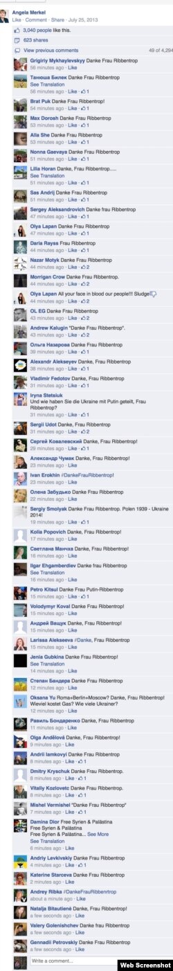 Старонку нямецкай канцлеркі Ангелы Мэркель у Facebook грамадзкія актывісты запаўняюць паведамленьнямі «Дзякуй, спадарыня Рыбэнтроп» («Danke Frau Ribbentrop»).