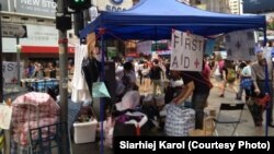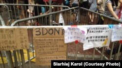 У пратэстоўцаў ёсьць на гугле сайт на кантонскай мове. На ім можна знайсьці ўсю інфармацыю: што ім трэба, што ўжо ёсьць, хто яшчэ што прынясе. Выглядае, што ўсё гэта арганізуецца праз інтэрнэт, сацыяльныя сеткі і мабільную сувязь. Гараджан заклікаюць дапамагаць зь ежай. Я таксама перад нашай размовай аднёс ім ежы і прыпасаў. Усё гэта яны вельмі арганізавана складаюць у абсалютна такія ж плястыкавыя торбы, якія выкарыстоўвалі беларускія мяшочнікі ў 90-я.