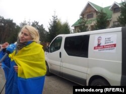 Тут жа каля Рады стаіць калёна аўтамабіляў са сьцягамі, пазнакамі аўтамайдану і агітацыяй супраць шчыратварага Алеся Доўгага. Пасьля акцыі ўсе разам выпраўляюцца ў Кіраваградзкую вобласьць, 102-ю выбарчую акругу.