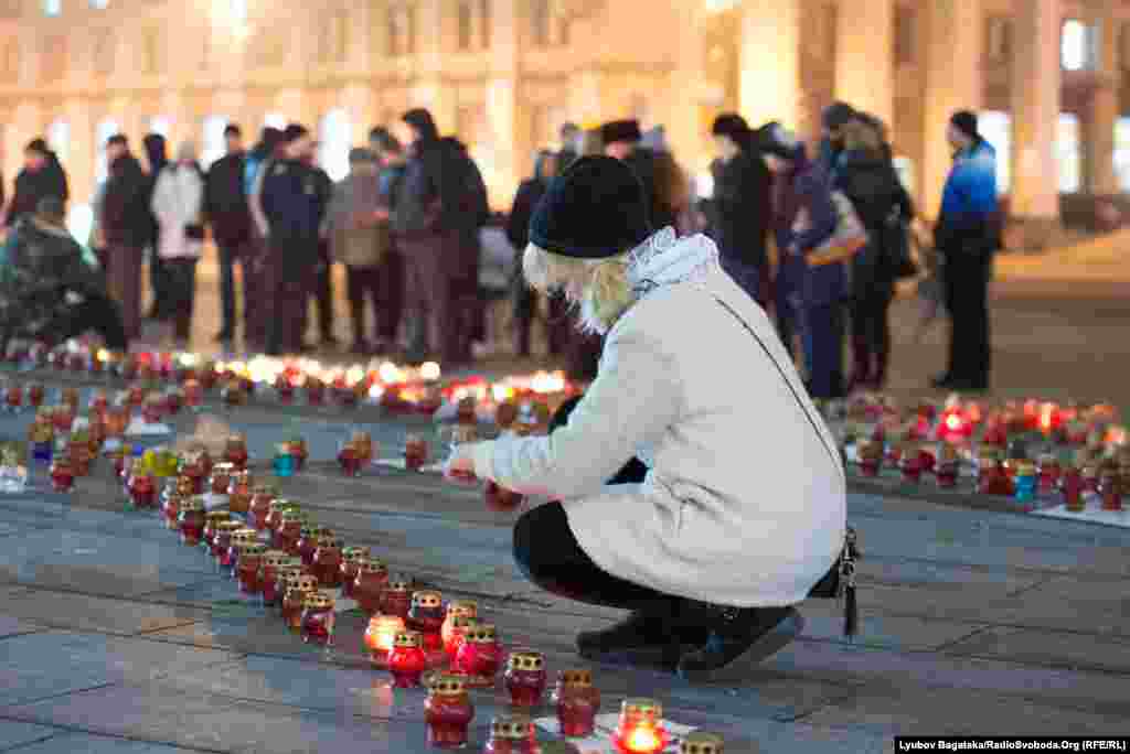 Кіяўляне пачалі прыходзіць на спантанны мітынг з 18:00 са сьвечкамі і кветкамі. І зараз на цэнтральнай плошчы сталіцы каля сотні неабыякавых грамадзян запальваюць лямпадкі па загінулых.