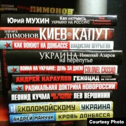 Сярод аўтараў — Лімонаў, Азараў, Каравулаў, якія пішуць пра Сьцяпана Бандэру, пра «генацыд» расейцаў ва Ўкраіне, вайну ў Данбасе — усяго прадаецца каля 20 найменьняў такіх кніжак, якія стаяць на паліцы побач з дэтэктывамі.