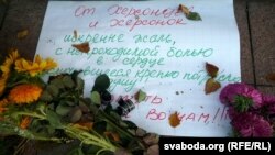 На прыступках Вярхоўнай Рады ў Кіеве людзі стыхійна стварылі мэмарыял памяці забітых падчас тэракту салдат Нацыянальнай гвардыі.