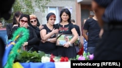 Труна Алеся пакрытая бела-чырвона-белым сьцягам. У грамадзе відаць бел-чырвона-белыя сьцягі і вянкі ў колерах украінскага сьцяга.